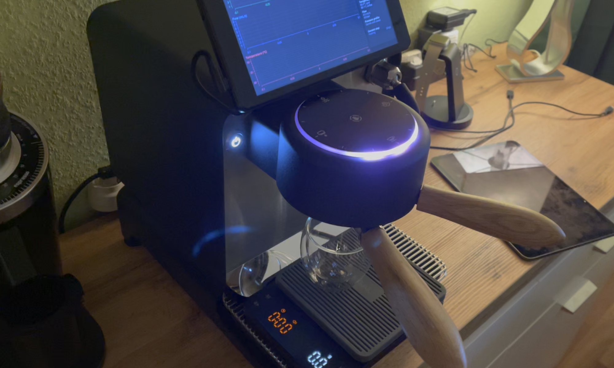 Die einfach solide Decent-Tampingstation mit dem Decent-v6-Tamper. Nach meinem Eindruck funktioniert das Tampen damit sehr sicher und reproduzierbar. Insbesondere das automatische Leveling durch den Auflagering ist ein Segen. Hübsch finde ich auch die einheitliche Oak-Optik von Siebträgergriffen und Tampergriff.