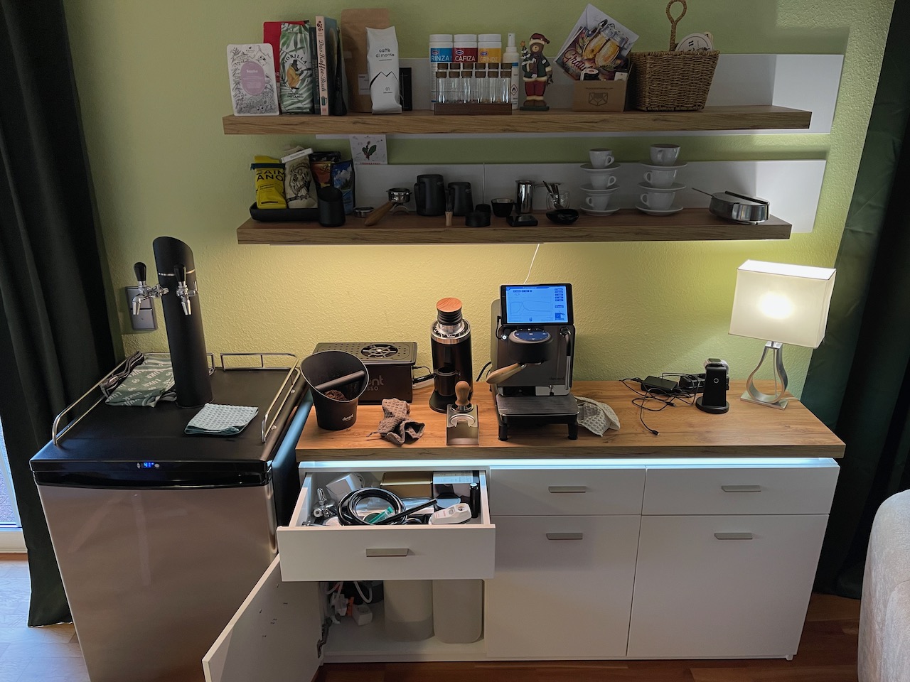 In der Schublade habe ich weniger genutzte Siebe, Tee-Siebträger-Kopf, Refraktometer, Bürsten, Filterpapier, wenig genutzten Puckscreen, Schlauchreste und anderen Kleinkram.
