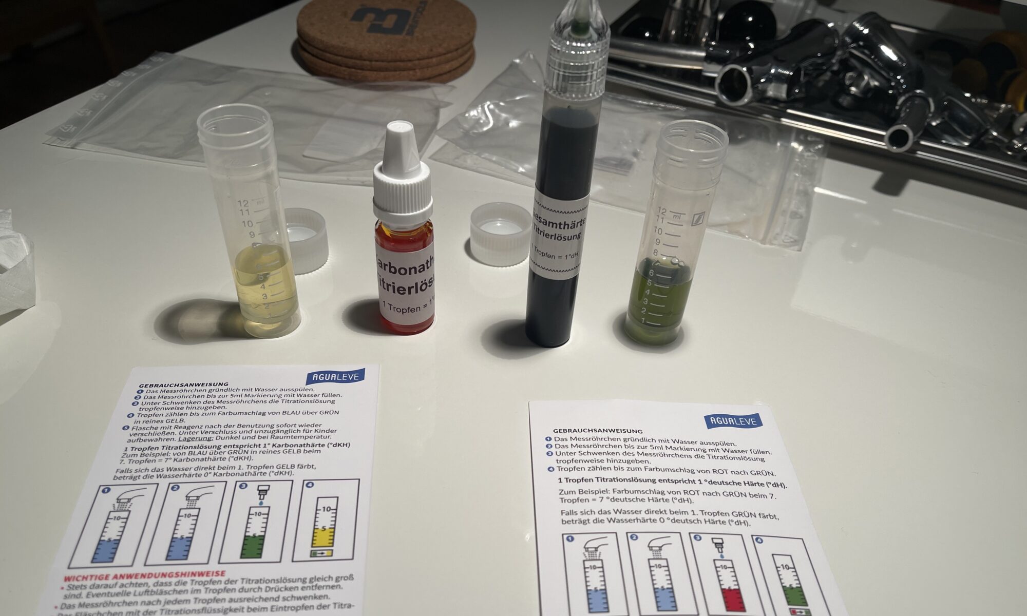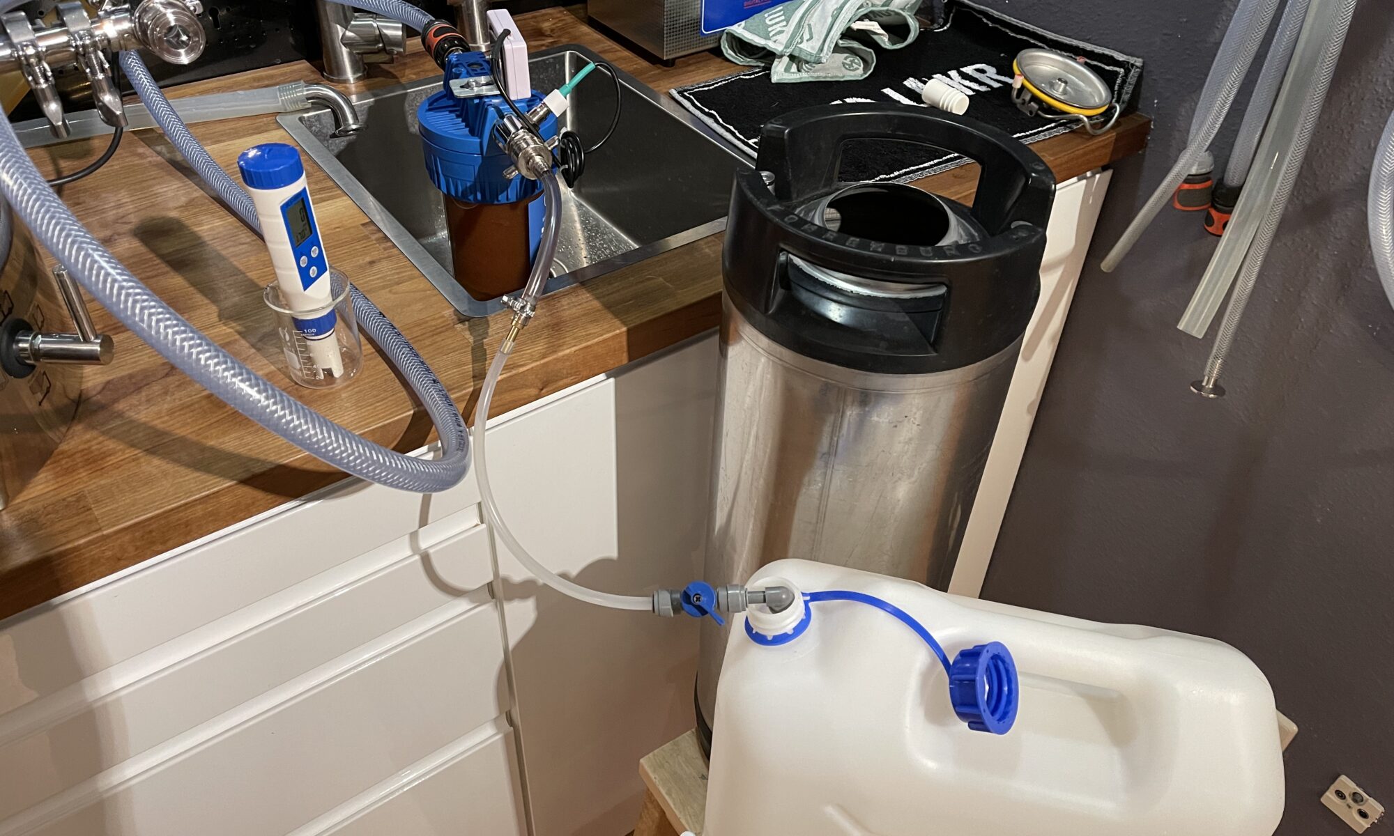 Zwei Wassertanks mit je 20 Litern Fassungsvermögen. In den Rechten wird über schwarze Schläuche hinter dem Schrank Abwasser aus den Ablaufschalen von Espressomaschine und Pitcher Rinser geleitet. Der Linke enthält aufbereitetes Frischwasser, das von Maschine und Pitcher Rinser mit Pumpen angesaugt wird. Da ich auch Hobbybrauer bin, beschäftige ich mich schon länger mit Wasseraufbereitung und habe einen Mischbettvollentsalzer, den ich einfach nur für eine Teilmenge des Wassers nutze und so auf ca. 120 ppm TDS komme. Die genaue Mineralienverteilung ist mir nicht so wichtig und die Alkalität sollte so ebenfalls in einem sehr guten Bereich liegen.