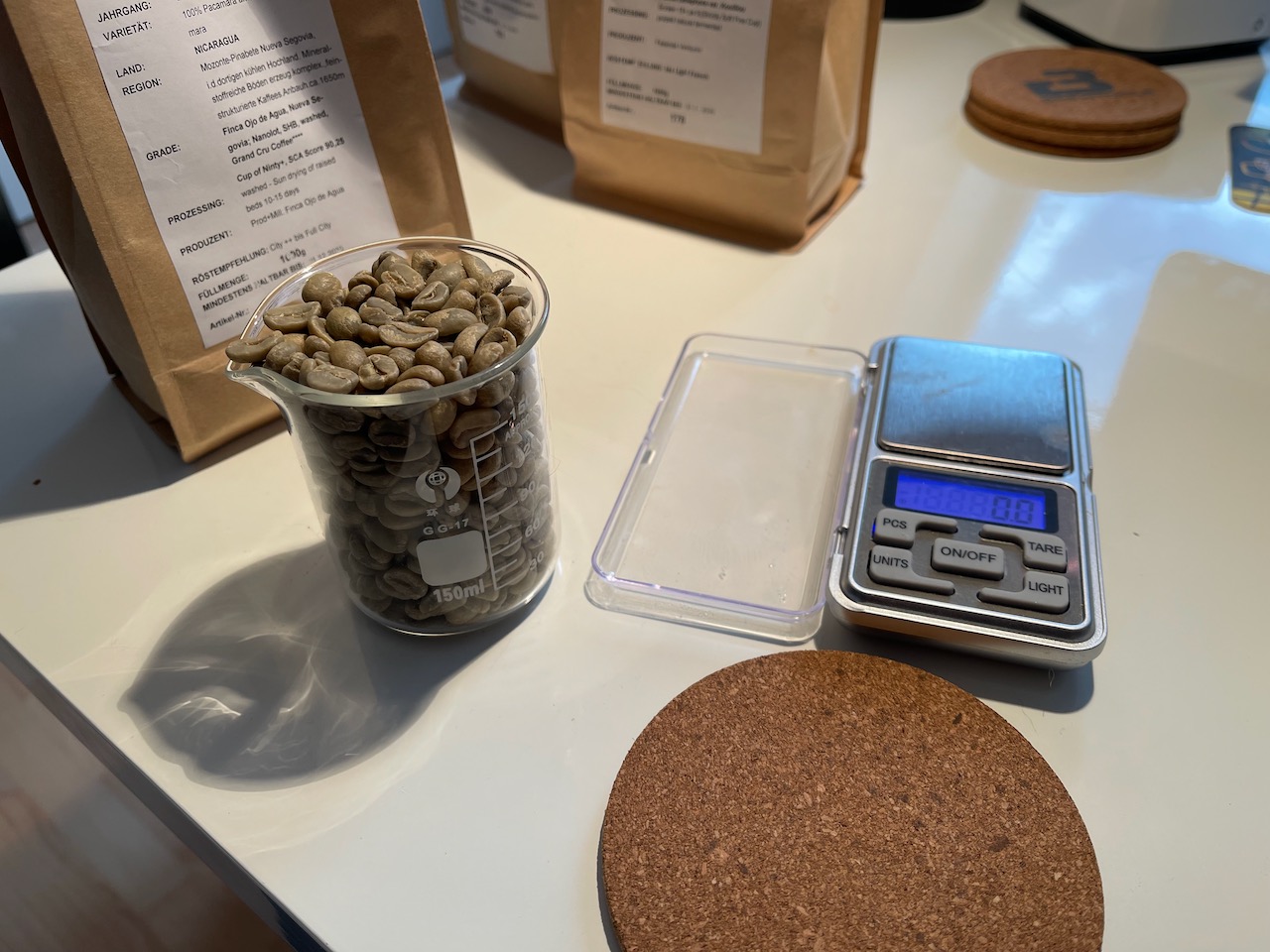 Dieses Schälchen ist hilfreich, um Bohnen (ohne die Becherwaage) abzuwiegen. Manchmal mit Gästen plane ich mehrere Shots, habe dann aber schon die zweite Menge vor der ersten in der Becherwaage.